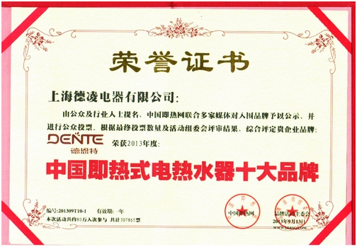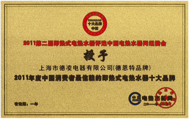 根據(jù)網(wǎng)上公示、公眾投票,組委會(huì)評(píng)審,為入圍品牌(產(chǎn)品)的知名度、美譽(yù)度、偏好度、滿意度、忠誠(chéng)度、市場(chǎng)以及品牌影響等多方面綜合評(píng)定,上海德凌電器有限公司品牌德恩特榮獲2012年度中國(guó)即熱式電熱水器十大品牌。 【中國(guó)即熱網(wǎng)www.jrrsq.com】